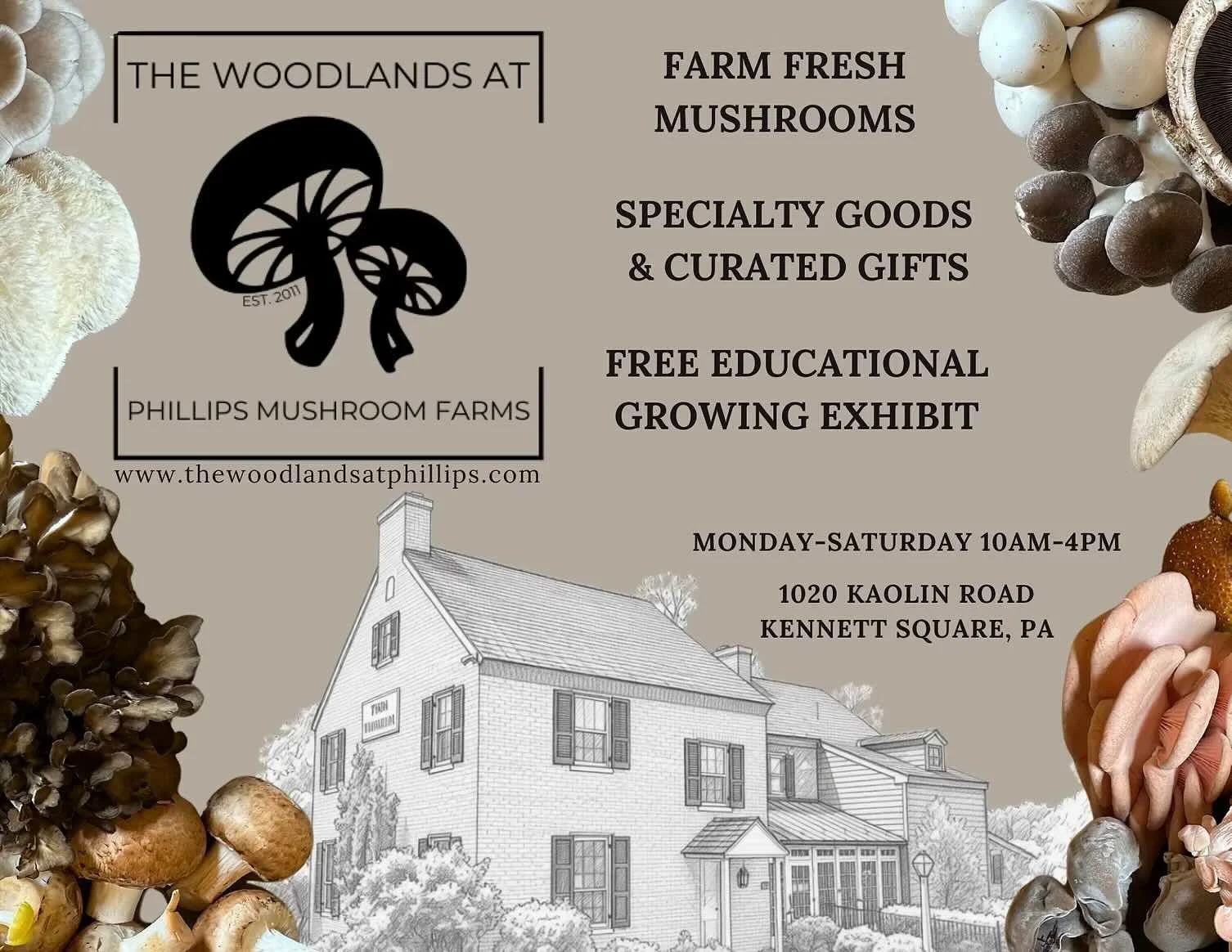 The Woodlands at Phillips Mushroom Farms provides fresh, dried, jarred, and specialty mushrooms to Chester County. Located in the heart of Mushroom Country, they offer a wide array of culinary delights and curated goods. Explore the store based out of an original 1828 farmhouse that was acquired by the Phillips Family in 1890. Check out their free growing exhibit to learn about growing fresh mushrooms and the rich local history of the Chester County Mushroom Industry.